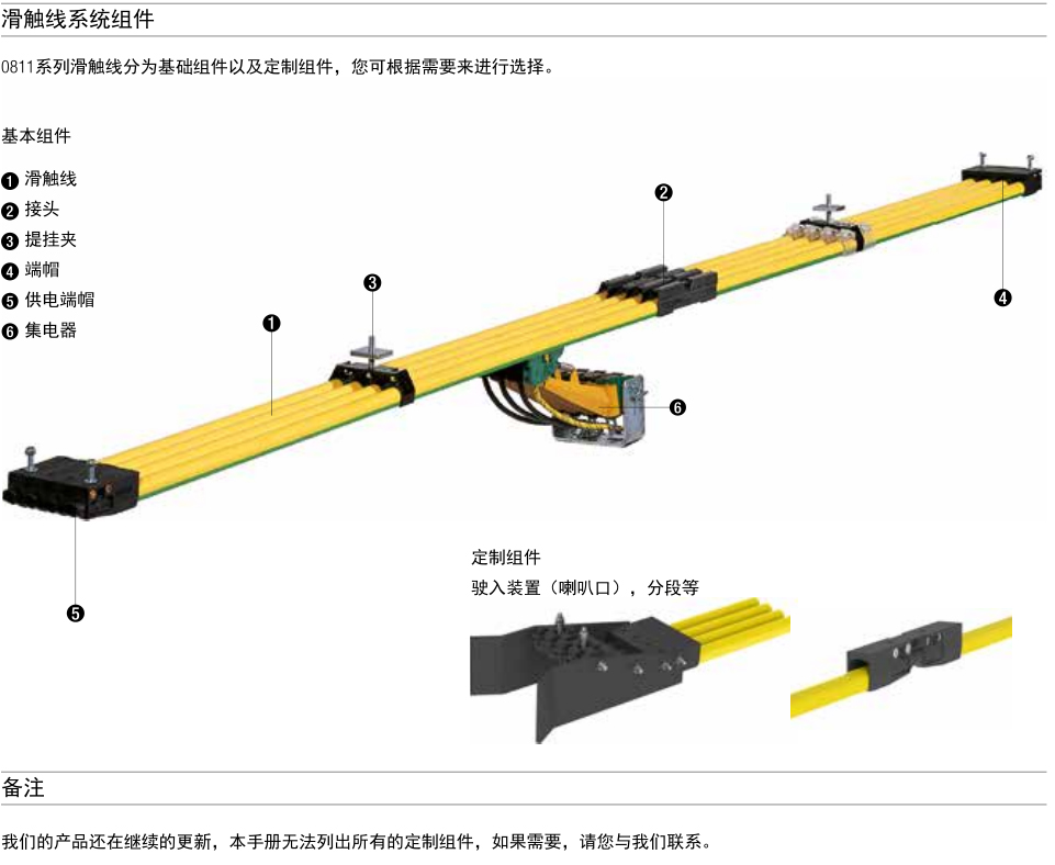 Conductix-Wampfler的0811系列组合式滑触线作为移动供电的标准产品已广泛的应用于各类工业环境产品部件设计灵活;可通过扩大滑触线线体端部开口方式,使得每一个普通接头都可以起到一个膨胀段的作用。